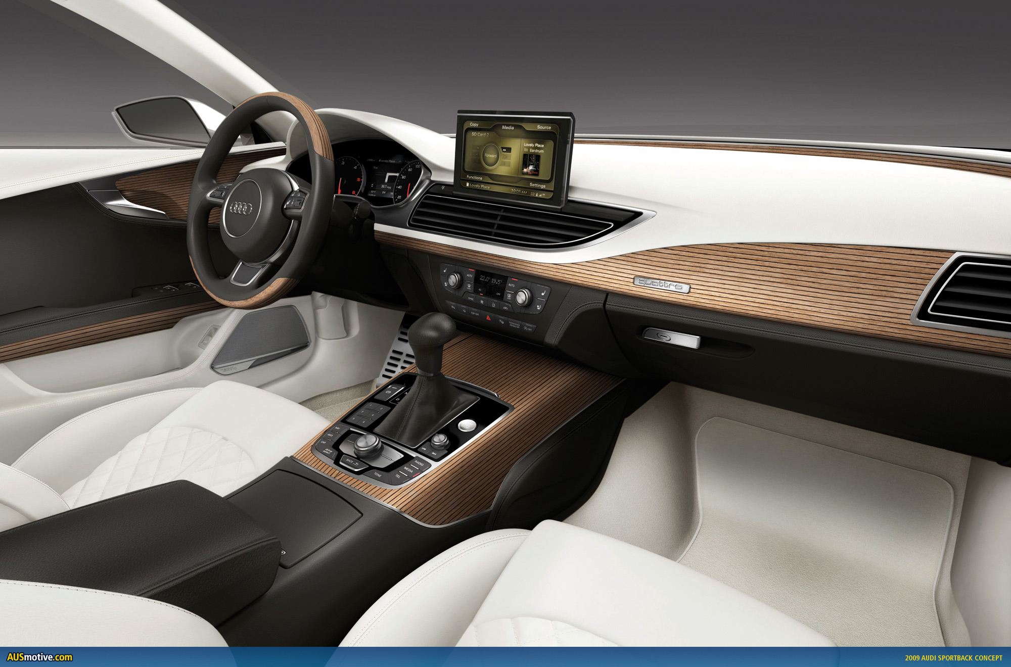 The electromechanical steering of the Audi Sportback concept also enables the coupling with the parking steering assistant for fully automatic steering when parallel parking.