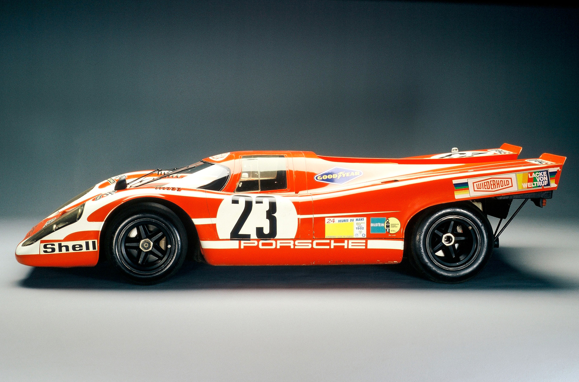 At the end of the 1970 race season, Porsche confirmed its superiority with the 917 and 908/03 models, winning the Racing Series World Championship [Markenweltmeisterschaft] in nine out of ten possible victories. This series of victories began at Daytona and continued at Brands Hatch, England, Monza, Italy, Spa, Belgium, on the Nürburgring race track in Germany, at the Targa Florio in Sicily, at Le Mans, France, Watkins Glen, United States of America, and the Österreichring, Austria. However, the season’s high point was the long-desired overall win of the Le Mans 24-hour endurance race, a trophy that Hans Herrmann and Richard Attwood brought home to Zuffenhausen on June 14, 1970. Their 917 short-tail model painted in the Porsche Salzburg colours of red and white, with the start number 23, not only successfully defied its competitors but also the heavy rainfall.