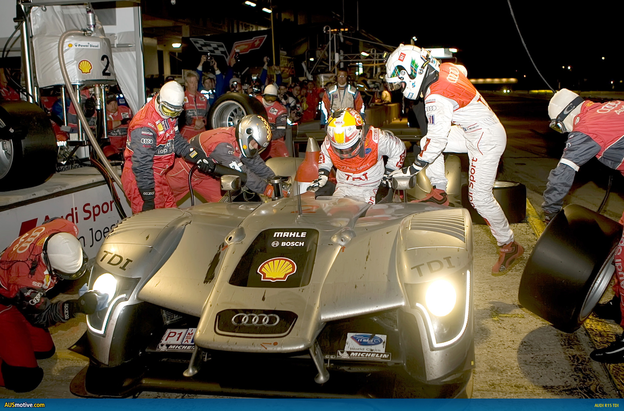In the exciting final stages of the race Allan McNish was able to fully exploit the optimized weight distribution and the sophisticated aerodynamics of the new R15 TDI compared to its predecessor, the R10 TDI. He was able to open such a big lead that he was able to stop for a ‘splash-and-dash’ just before the end of the race without losing the lead. He eventually crossed the finish line 22.279 seconds in front of the second placed Peugeot.