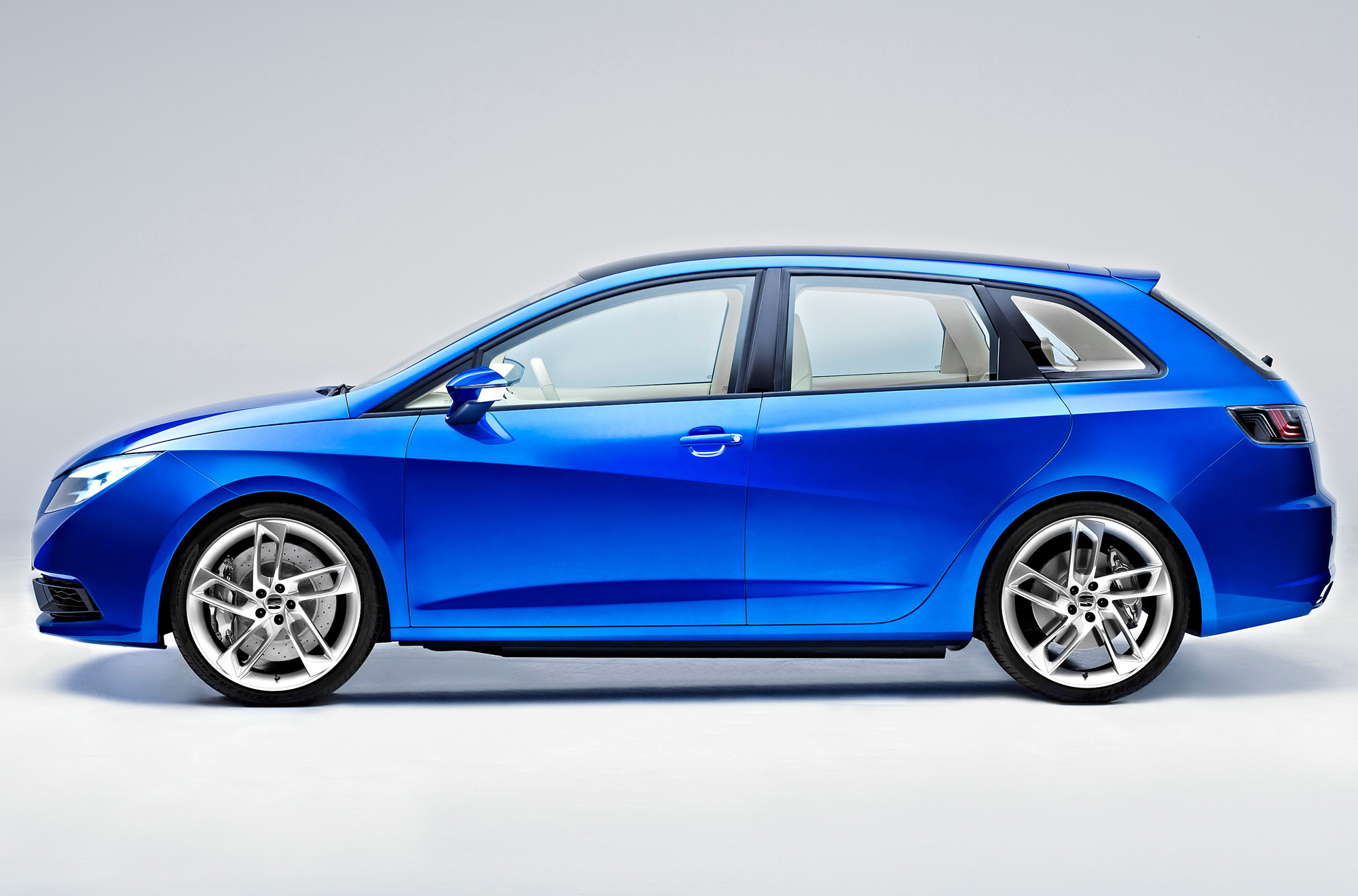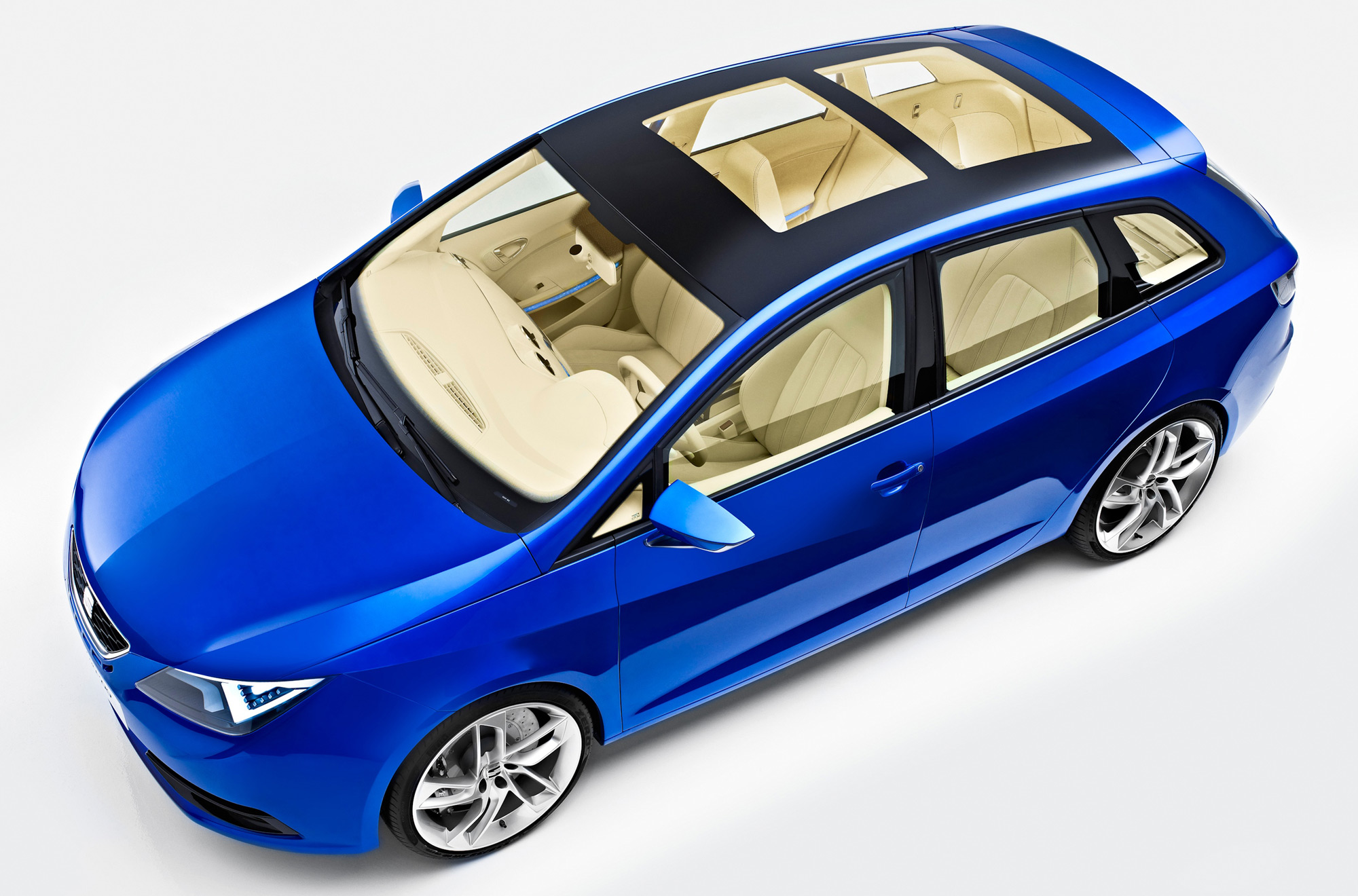The exterior design of SEAT’s prototype is enhanced by its high gloss, eye-catching blue paint colour while a broad panoramic sunroof floods the interior with light.