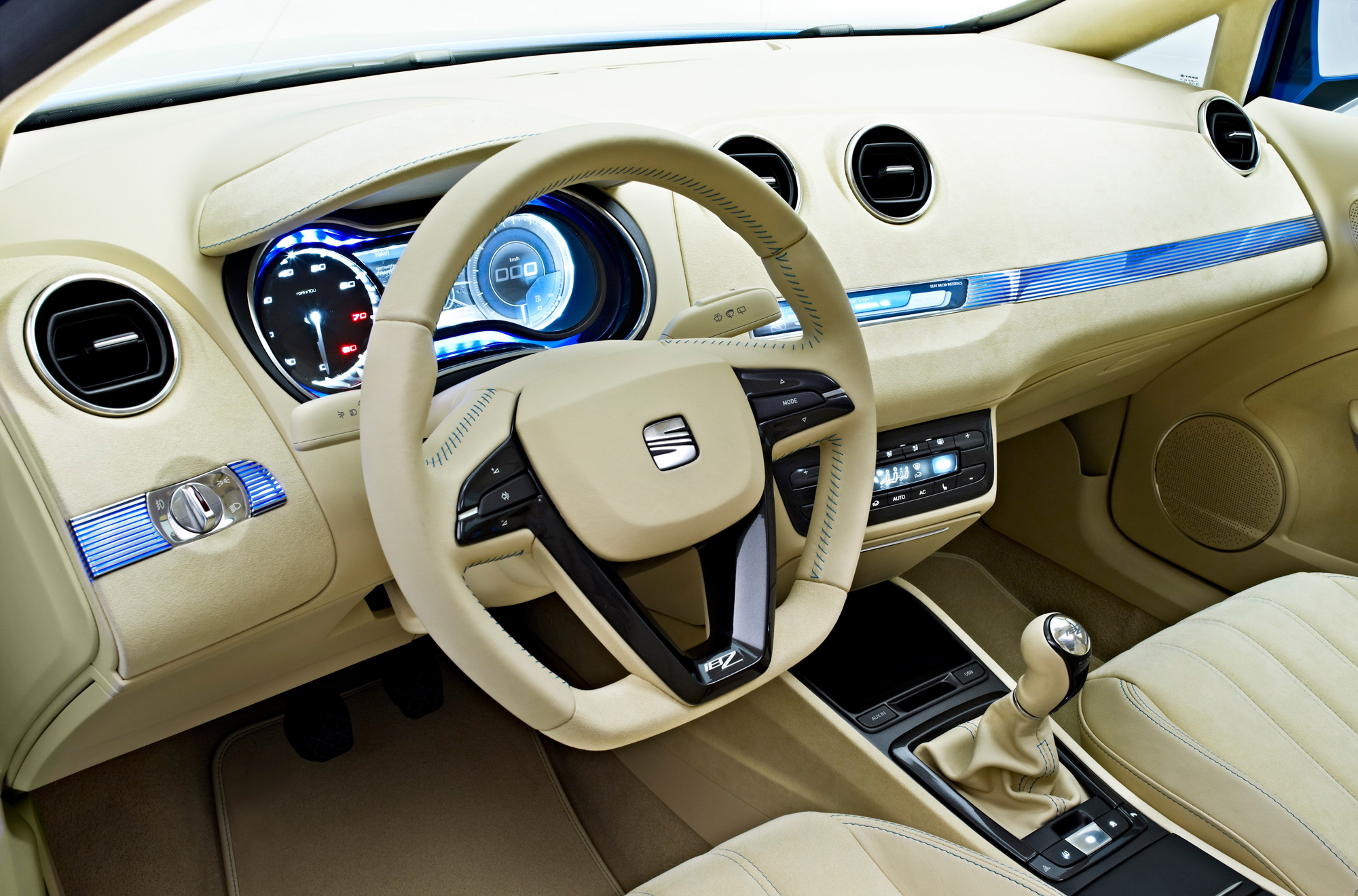 In trademark sporty SEAT style, the steering wheel on the IBZ Concept is slightly flattened at the base. It is wrapped in leather and suede and has a four-spoke structure with dipped side grips, the SEAT ‘S’ in the centre and the letters ‘IBZ’ on the lower spoke, and a set of newly designed multi-functional controls on either side.