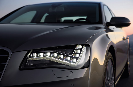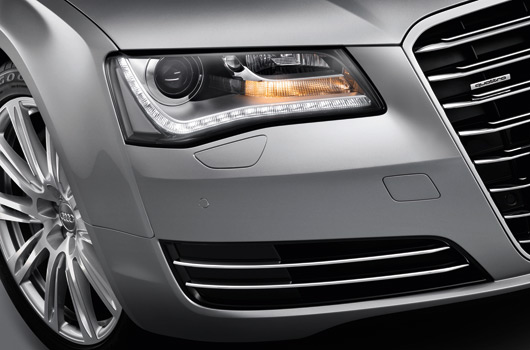 Full LED headlights, which use light emitting diodes for light functions, give the new A8 an unmistakable appearance. The revolutionary optics used in the headlights are a departure from the tubular light modules more commonly used.