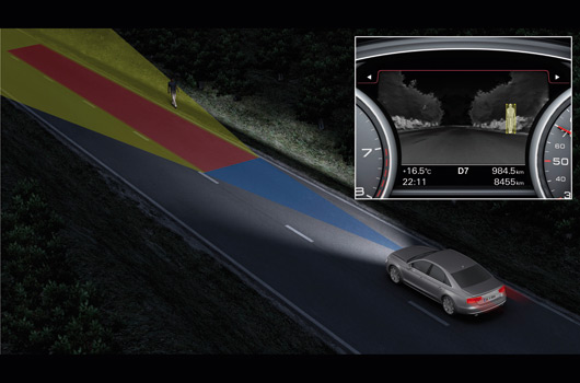 MMI navigation plus is networked with the new Audi A8’s advanced driver assistance and safety systems. It follows the route in advance during driving and provides the data to the control units for the automatic transmission, the headlights and the Adaptive Cruise Control ACC stop & go function. These enhanced systems recognise complex scenarios and anticipate decisions to assist the driver. Night vision assist with marking of detected pedestrians, Audi pre sense safety system and speed limit display will all make their debut on the new Audi A8.