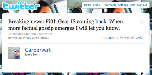 Tiff Needell has also confirmed via Twitter that Fifth Gear will be returning: “Home to the news that, after much negotiatiing Fifth Gear looks like it will after all be returning to your screens sometime in the Spring!”