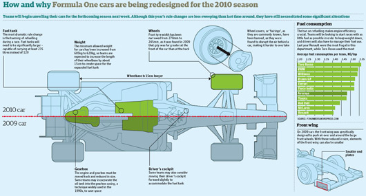 While the technical regulations for 2010 don’t differ too greatly from 2009 one big change is the lack of in-race refuelling for the 2010 season. The preview above, courtesy of The Guardian, gives a brief rundown of the changes to expect and how the larger fuel tank, basically double the size of the 2009 cars, will affect other aspects of F1 car design.