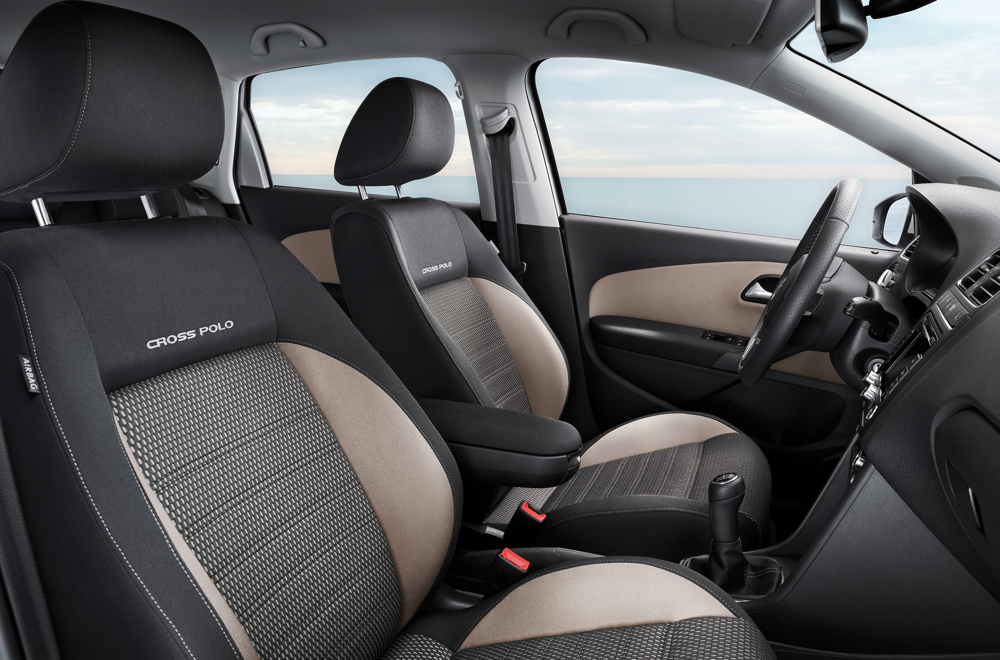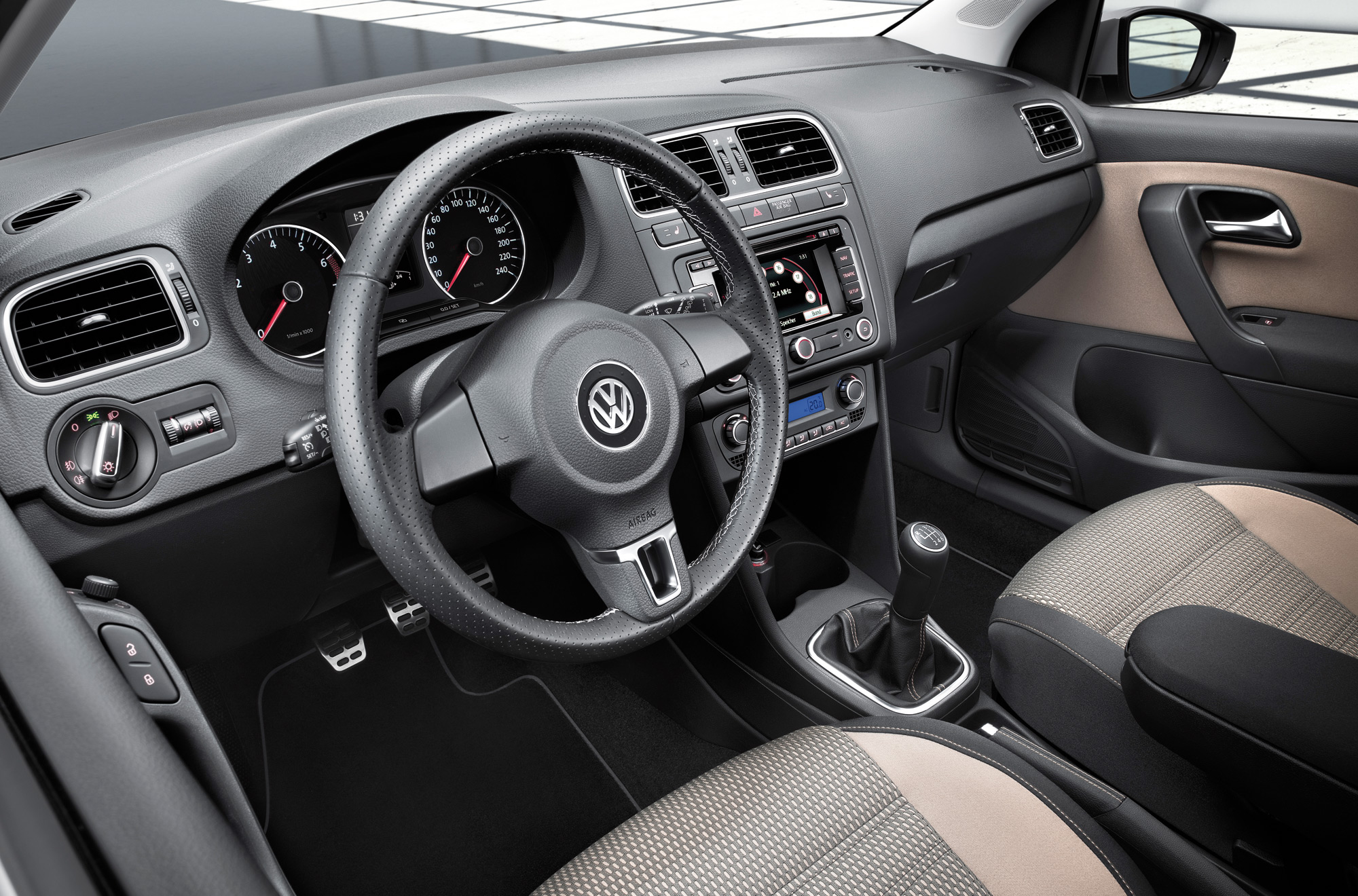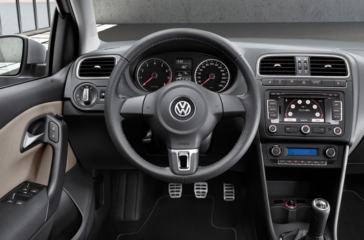 Throughout the cockpit materials are friendly to the touch. Take the steering wheel: It has a fine perforated leather cover; the steering wheel spokes are produced from a brushed chrome application. The seams of the steering wheel cover and the leather-trimmed parking brake handle are given the colour of the interior trim. The CrossPolo’s high level of quality is highlighted by the instrument panel, finished in “Slush†technology with its soft surface texture that is pleasant to the touch.
