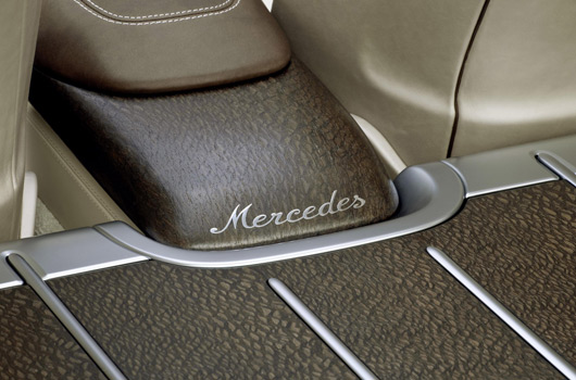 The Shooting Break concept car is clearly a four-seater. The four identically shaped leather seats have a touch of the sports car about them thanks to their integrated head restraints. Openings in the upper area of the backrests make it possible to see through the seats. A large full-length wood console on the transmission tunnel provides a visual divide between driver and front passenger and at the same time indulges the occupants with two large leather-covered armrests. It also houses two cup holders as well as controls for the rear-compartment air conditioning. The centre console is finished off at the rear with inlaid work: curved Mercedes lettering which harks back to the style of the 1920s. The striking cursive-script lettering is also repeated on the front door sills.