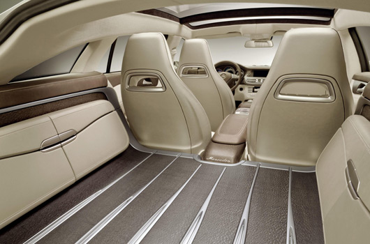 The interior is dominated by natural wood and leather materials. One eye-catching feature is the large full-length centre console. It highlights the four- seat layout as well as the high levels of comfort afforded by the Shooting Break concept car. The wooden floor of the luggage compartment reflects the true interpretation of this area of the vehicle, where the dark-stained silky oak contrasts against inlaid aluminium protective loading strips.