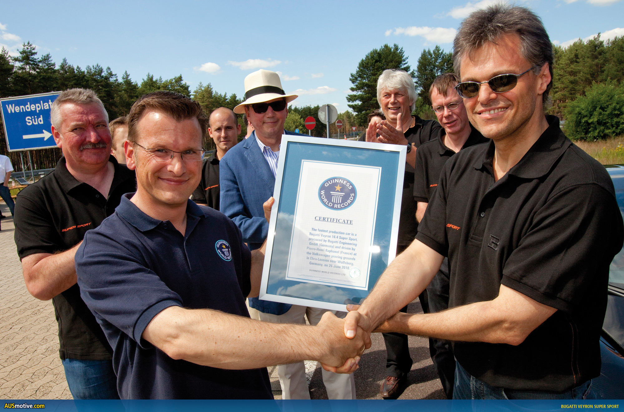 Wolfsburg/Molsheim, July 5, 2010 – On a beautiful sunny day at 25 degrees the Bugatti Veyron 16.4 Super Sport achieved a new landspeed world record for production cars, on the proving grounds of the Volkswagen Group at Ehra-Lessien (nearby its headquarters at Wolfsburg). In the presence of the German Technical Inspection Agency (TÜV) and a representative of Guinness Book of Records the Super Sport achieved an average top speed of 431 km/h.