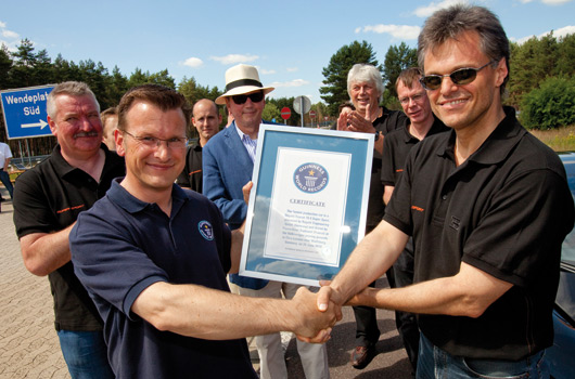 Saturday, 2 pm – Bugatti’s Pilote Officiel Pierre Henri Raphanel puts his helmet and gloves on, pulls the safety belts tight whilst the engineers check the car a very last time: tyre pressure, temperature, all systems green. Then the orange black Super Sport crosses the light barrier, from now on the time will be taken, within one hour the car has to drive from South to North and then in the opposite direction. No one but the driver is allowed to touch the car during this time. The tension rises. A few minutes later we can hear from the left side the sound of a starting jumbo jet coming closer towards us. First we perceive the headlights of the Veyron, then we can recognize the shape of the car, a loud wooosh…. and Raphanel dashes in top speed past us. The GPS-tachometer stops at 427, 933 km/h. Now the same procedure from the opposite direction. This time the car reaches 434, 211 km/h. As average top speed the representatives of the “TÜVâ€and Guinness generate a value of 431, 072 km/h (268 mph). This hit even Bugatti’s engineering team by surprise.