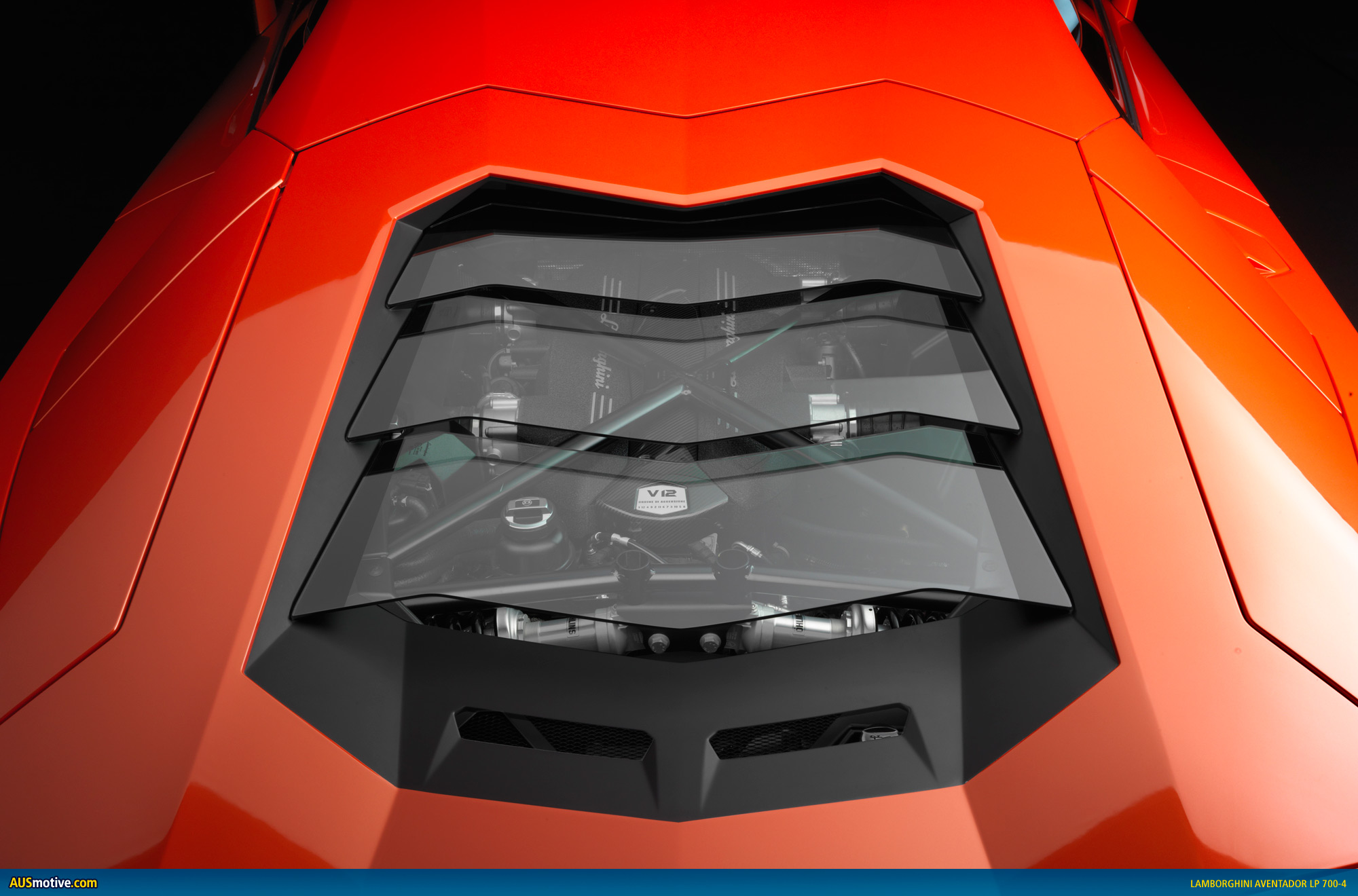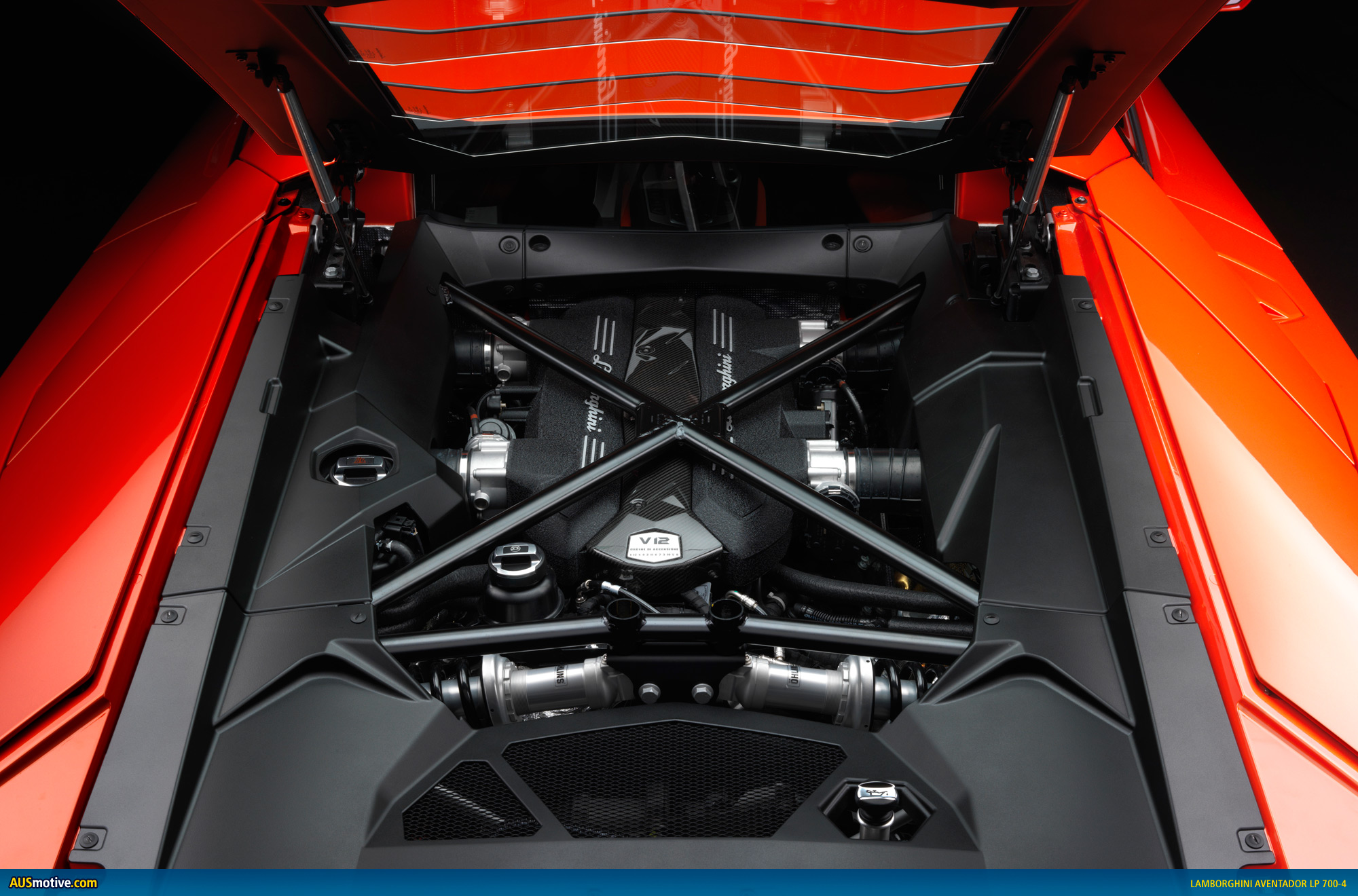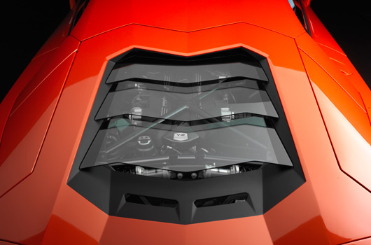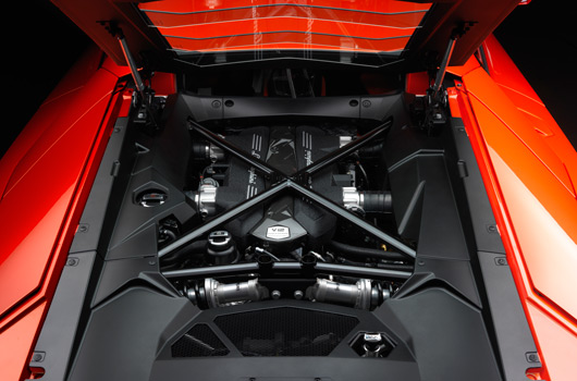 For the Aventador LP 700-4, the engineers in Lamborghini’s R&D Department have developed a completely new high-performance power unit – an extremely powerful and high-revving, but very compact power unit. At 235 kilograms (518 lb), it is also extremely lightweight. A V12 with 515 kW (700 hp) at 8,250 rpm sets a whole new benchmark, even in the world of super sports cars. The maximum torque output is 690 Newton meters (509 lb-ft) at 5,500 rpm. The extremely well-rounded torque curve, the bull-like pulling power in every situation, the spontaneous responsiveness and, last but not least, the finely modulated but always highly emotional acoustics are what make this engine a stunning power plant of the very highest order.