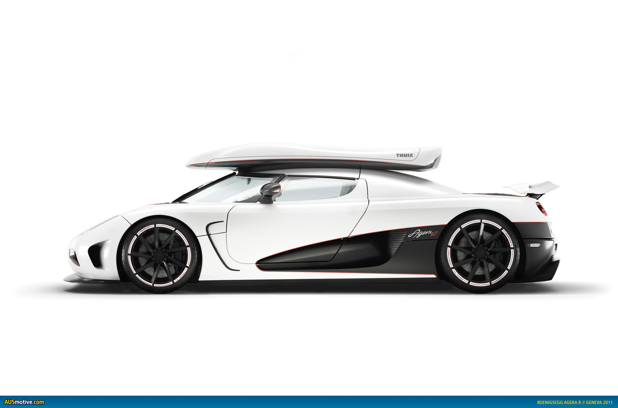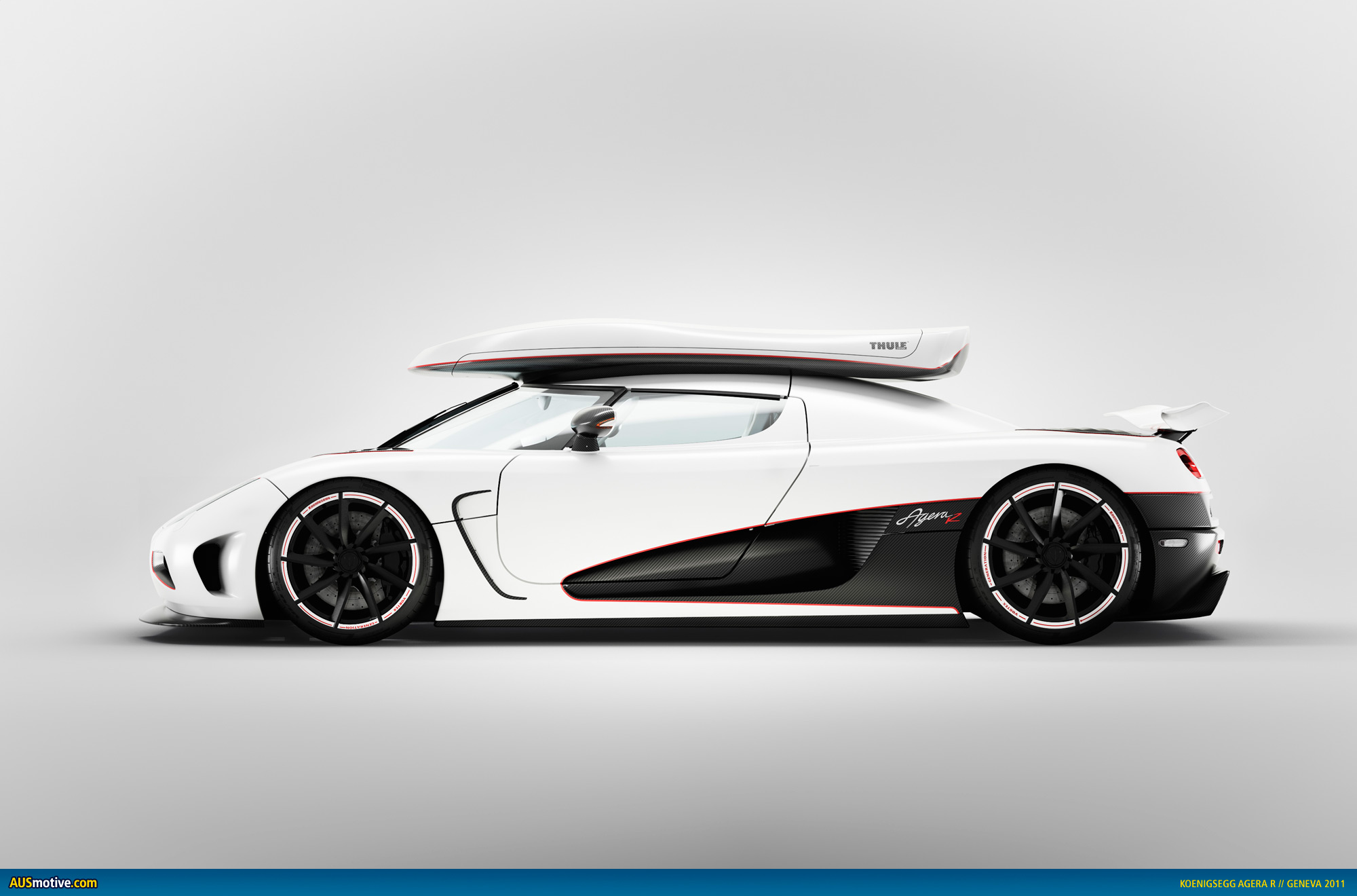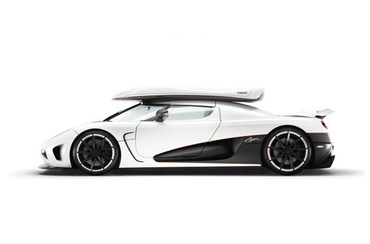 This year at the Geneva Motor show Koenigsegg is presenting the brand new Agera R – Quicker than lightning! The Agera R on the Koenigsegg show stand – production car #83 – is inspired by the legendary Speed Racer theme, as specified by the owner of the car. Speed Racers main colour is white – so is snow. Equipped with special Michelin tires and a custom made Thule Roof Box – Speed Racer is ready to attack the ski resorts!