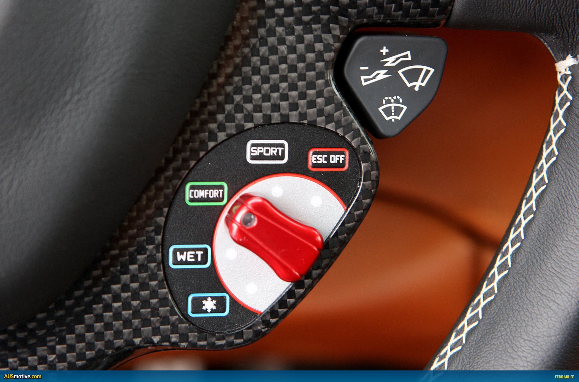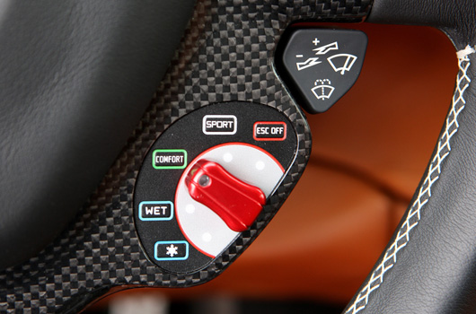 In fact, because they are ergonomically positioned on the steering wheel, the onboard controls feel like a natural extension of the driver’s body and fingers and he will never actually have to lift his hands off the rim when shifting gears or making any other adjustment to the car’s systems. Aside from the Manettino, which offers a choice of five different vehicle dynamics settings, the steering wheel also features the engine Start button, indicators, the two F1 gear-shifting paddles (Up & Down), the suspension decoupling button to decouple damper settings from the other manettino configurations for softer damper response on uneven surfaces, and windshield wiper controls.