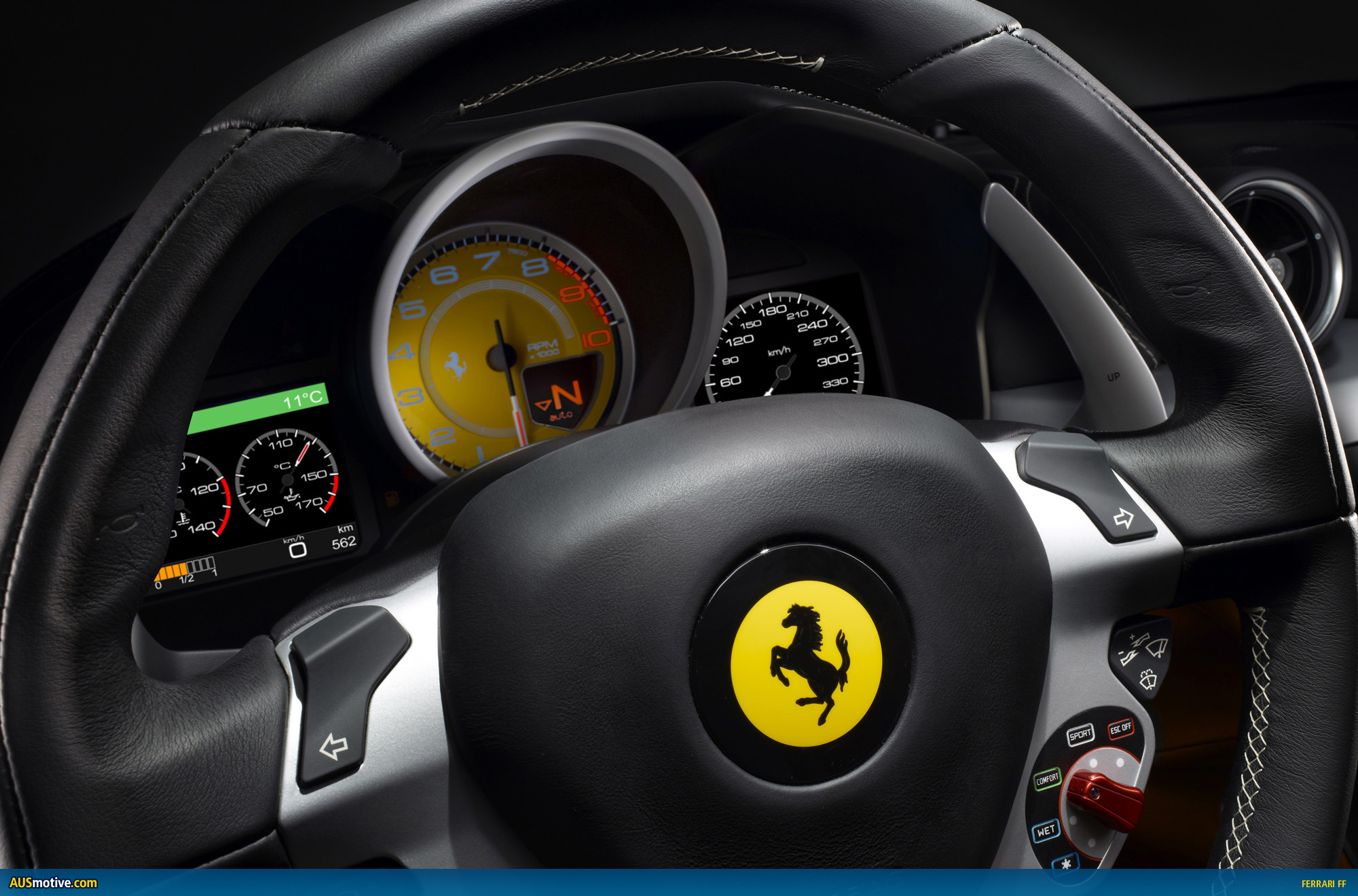 Once behind the wheel, the driver will feel instantly at one with his car. Years of research by Maranello’s engineers, Ferrari’s track experience and ongoing dialogue with drivers have turned the Prancing Horse into a winner across the globe. In the FF, the fruit of this unparalleled wealth of knowledge has been focused on not only on improving each individual detail, but also linking them ergonomically, to ensure that the driver remains perfectly at ease regardless of whether he is simply out for a relaxing Sunday spin or clocking up the laps on the track. This is what Ferrari calls the Human-Machine Interface, the effortless melding of man and car. Every single control and all the car’s main functional data are instantly to eye and hand at all times and in all conditions.