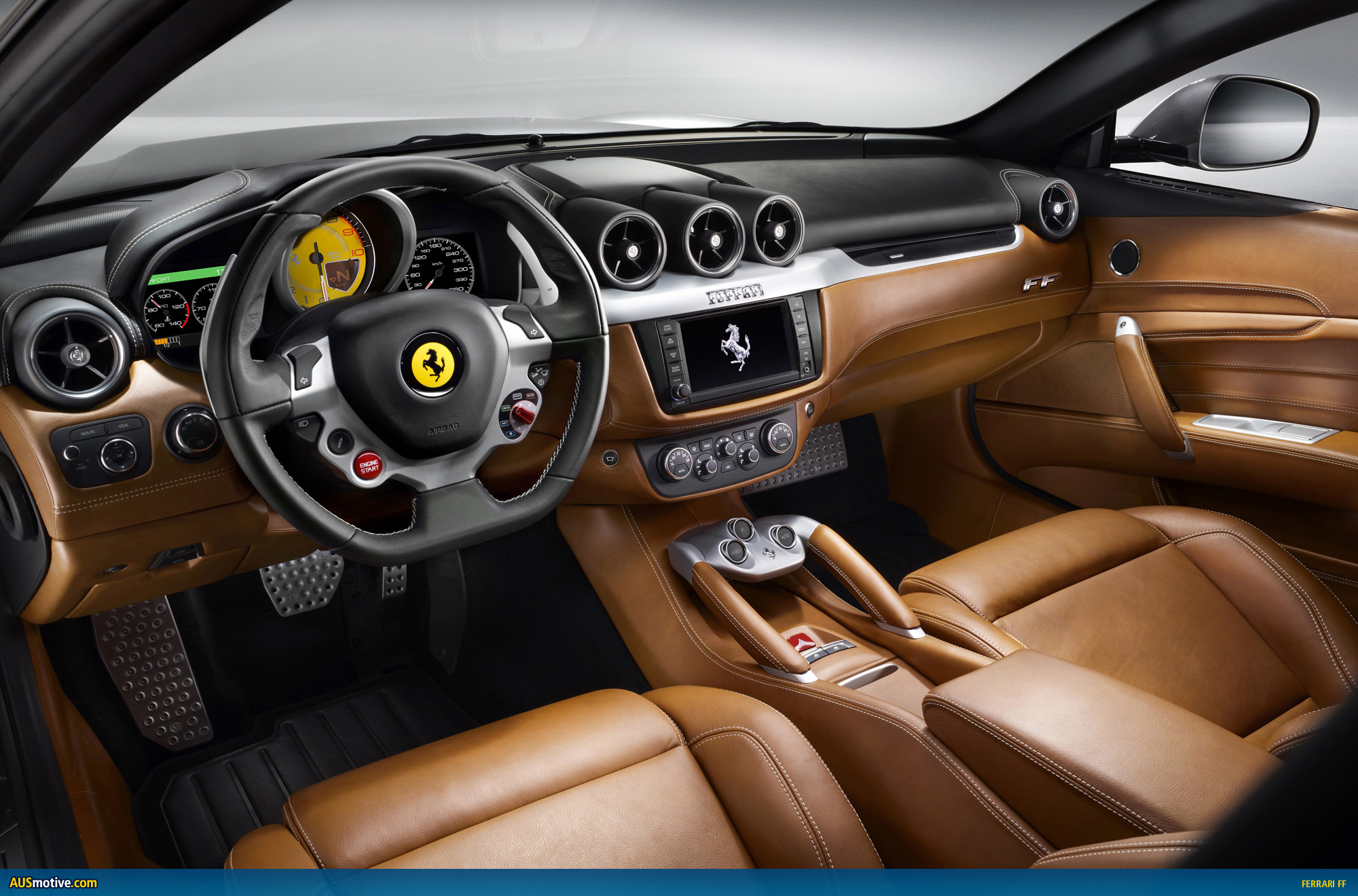 Make no mistake about it: the FF has the DNA of a thoroughbred Ferrari. It is not only sporty in the extreme but also comfortable and easy to handle. It brings a wealth of technology to the mix, starting with a completely new mid-front-mounted 6,262 cc GDI V12 that delivers unprecedented performance and responsiveness at all engine speeds: 660 CV at 8,000 rpm, a specific output of 105 CV/l (77 kW/ cu in), a weight-power ratio of 2.7 Kg/CV. The torque is also blistering: 683 Nm at 6, 000 rpm, 500 Nm available from 1,000 rpm up to 8,000 rpm (virtually across the entire range), guaranteeing unparalleled versatility.