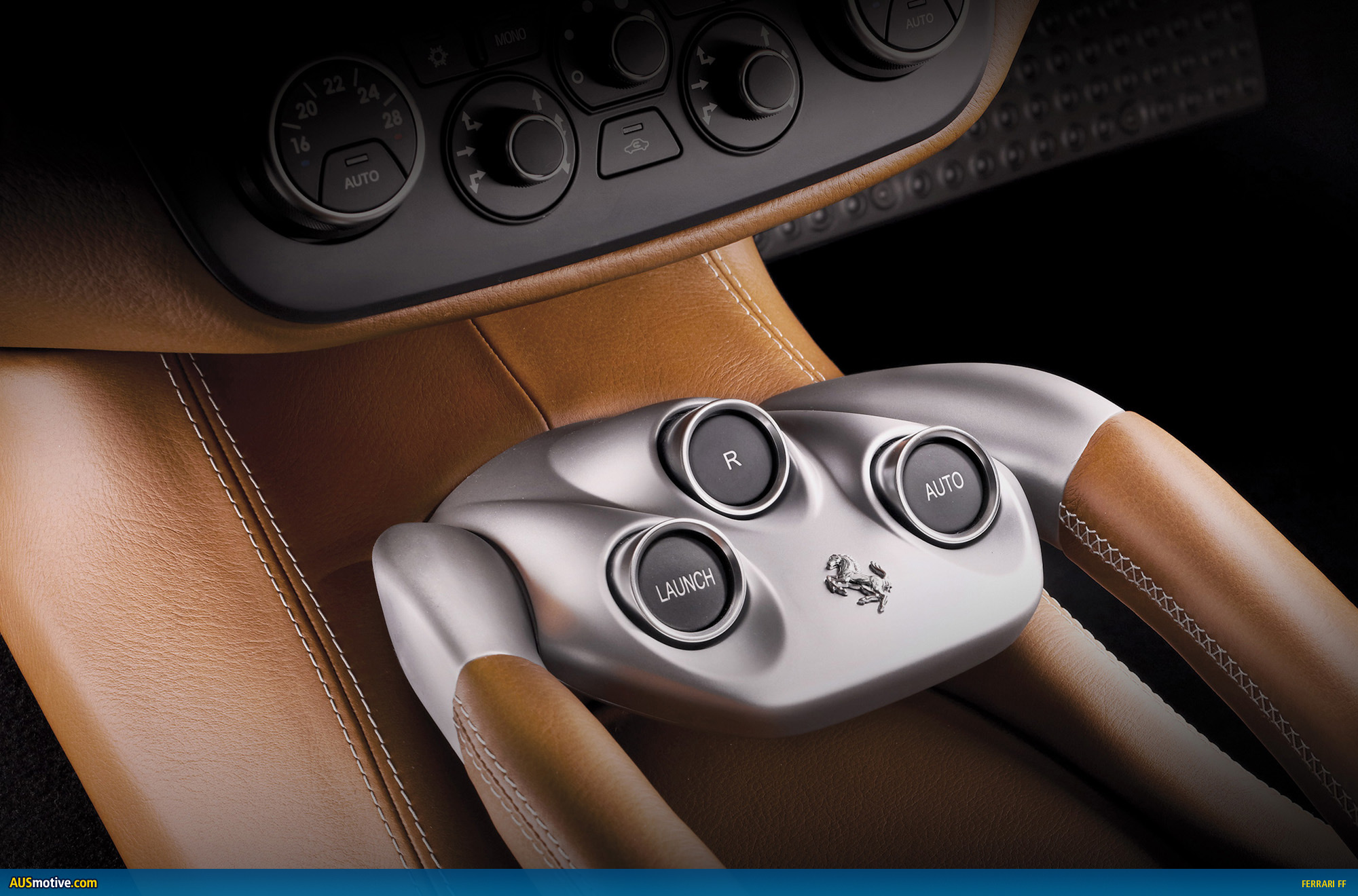 The centre console houses the F1 panel and its dynamic controls: the Launch Control button which sends maximum torque to the ground for spin-free, high-performance starts in all conditions including snow and ice; reverse, and the Auto switch to put the gearbox in automatic.