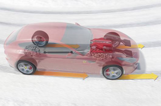 The F1 dual clutch gearbox combines the unadulterated driving pleasure of a sequential gearbox with the comfort of an automatic one. Gear-shifting times have been cut to zero and the acceleration gap typically experienced with manual and electrohydraulic gearboxes has been completely eliminated. The E-Diff is now integrated into the gearbox casing itself, a solution that has helped reduce the car’s overall weight. Ferrari’s first ever four-wheel drive system actually shares a CPU with the E-Diff and F1-Trac. This fact, combined with instantaneous grip estimation on any kind of surface, guarantees perfect driveability and handling even when conditions are so poor that the rear-wheel drive can no longer send enough power to the road. This is the kind of situation drivers typically find themselves faced with on extremely slippery icy or snow-covered surfaces.