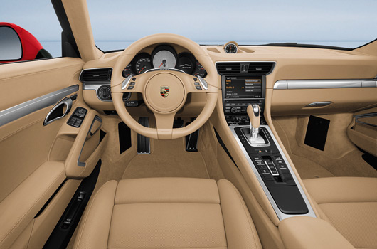 To complement the modern exterior design, the Porsche designers created an interior, the architecture of which takes its cue from the Porsche Carrera GT. The driver is now even more closely integrated with the cockpit thanks to the centre console rising up to the front with the high-mounted shift lever or gear selector located especially close to the steering wheel in typical motorsport fashion. Classic Porsche elements are also to be found inside, as they are on the outside: the instrument cluster with five round instruments – one of them a high resolution multifunction screen, the central rev counter and the ignition lock to the left of the steering wheel.