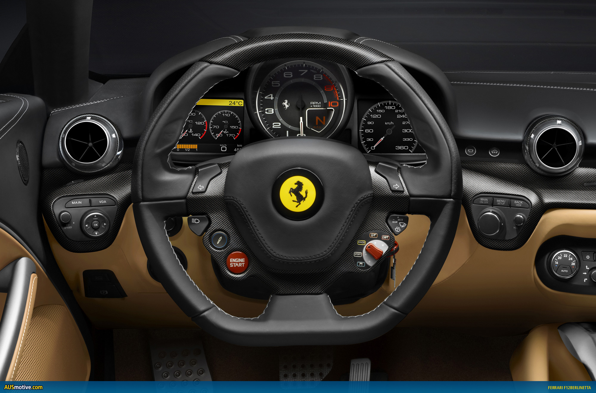 The design of the F12berlinetta is a result of the collaboration between the Ferrari Styling Centre and Pininfarina and is a perfect balance of uncompromising aerodynamics with harmonious proportions interpreting the typical elements of Ferrari’s front-engined V12 cars in an original and innovative way. A coupé with sleek, aggressive lines whose compact exterior dimensions conceal exceptional in-car space and comfort. The all-new Frau leather interior highlights the balance of advanced technology and sophisticated, handcrafted detailing. In the middle of the light and lean dashboard, there are new carbon fibre and aluminium air vents clearly inspired by the aeronautic field.