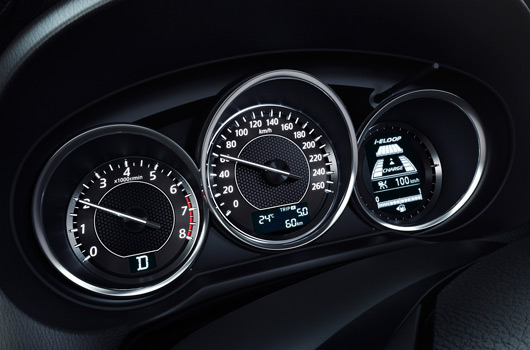 - The driver-oriented cockpit offers generous space. Three instruments laid out symmetrically beneath the meter hood heighten the expectation for exciting driving.