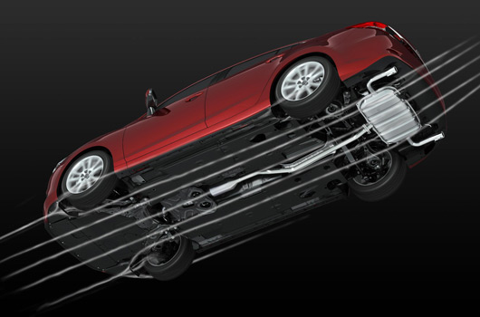 - The optimised under-floor design improves aerodynamic performance by smoothing the airflow under the vehicle and minimising the trailing vortex by directing the exiting airflow upwards via the tail-up design of the main exhaust silencer.