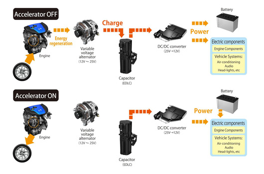 Electricity stored in the capacitor can then be used to power electric components throughout the car. In freeing the engine from much of the duty of providing electricity to these components, more fuel energy goes directly to powering the car, resulting in further improvements in fuel economy. In addition, a variety of advanced active safety technologies have been adopted for new Mazda6.