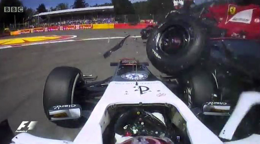 When looking at the first corner mayhem from the Belgian Grand Prix on the weekend it was quite astounding to see that Sauber’s Kamui Kobayashi was able to escape this contact relatively unharmed. Sure, he finished in P13, well below the potential offered by his front row start, but as the series of images after break show, it could have been much worse!