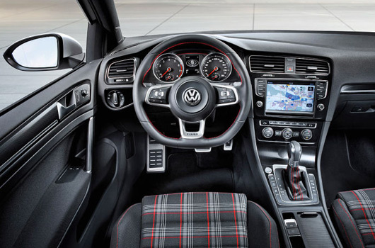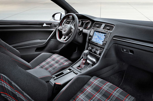 It’s standard GTI fare inside, including the familiar tartan trim and red stitching on the bolstered sports style seats. The red stitching extends to the new three-spoke steering wheel and other selected interior features.
