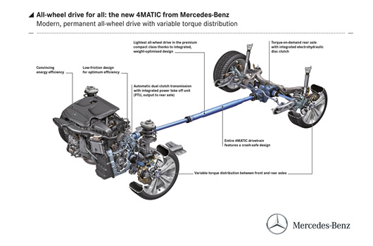 The most innovative components of the new 4MATIC include the power take-off to the rear axle which is integrated in the 7G-DCT automated dual clutch transmission and the rear-axle gear with integrated, electrohydraulically controlled multi-disk clutch. This set-up enables fully variable distribution of the drive torque between front and rear axle. Additional benefits of this design are a lower system weight than is available from the competition and high efficiency. Similarly to the front-wheel-drive versions, all 4MATIC models also boast good energy efficiency.