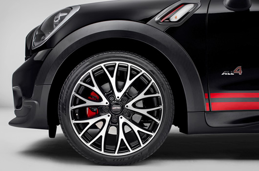 And the likewise standard Sport Button on the centre console allows the driver to tweak the engine’s responses and soundtrack, as well as the power assistance provided by the steering. If the automatic gearbox is specified, pressing the Sport Button also quickens up shift times. 18-inch light-alloy wheels in Twin Spoke Black Burnished design with polished spoke fronts and black rim wells are standard on the MINI John Cooper Works Paceman. Among the items on the options list are exclusive 19-inch light-alloy wheels in Cross-Spoke Crusher design.