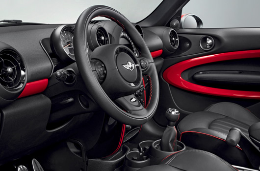 The extrovert design of the MINI John Cooper Works Paceman gives the first Sports Activity Coupé in the compact segment a dynamic presence, brimming with forward-surging intent and agility – before it even turns a wheel. The powerfully formed front end, elegantly sporty, stretched lines of the flanks, coupé-style roof swooping downwards towards the rear, and broad rear end of the three-door car all ooze sporting allure. And the aerodynamic kit fitted as standard on the MINI John Cooper Works Paceman shines extra light on this performance-maxing character. The particularly muscular form of the front and rear aprons and bespoke side skirts ensure the airflow around the car is even more efficient. John Cooper Works logos on the radiator grille, tailgate and door sill strips as well as next to the side indicators provide additional confirmation of the car’s identity. Customers can choose from nine exterior paint finishes, including the Chili Red shade reserved for the John Cooper Works model. Chili Red is also available exclusively for the MINI John Cooper Works Paceman’s contrast-colour roof, exterior mirror caps and Sport Stripes.