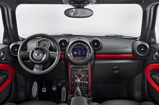 The distinctive character of the MINI John Cooper Works Paceman is underlined by bespoke design features. Standard specification includes an aerodynamic kit, 18-inch light-alloy wheels, a sports exhaust system with chrome tailpipes, and door sills bearing the John Cooper Works logo. As well as white and black, the exclusive Chili Red paint finish can also be specified as an option for the contrast-colour roof and exterior mirror caps. And customers can also lend an extra edge to the typical John Cooper Works sports car feeling inside the car with bespoke accents such as Chili Red interior trim strips.