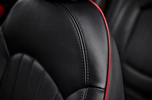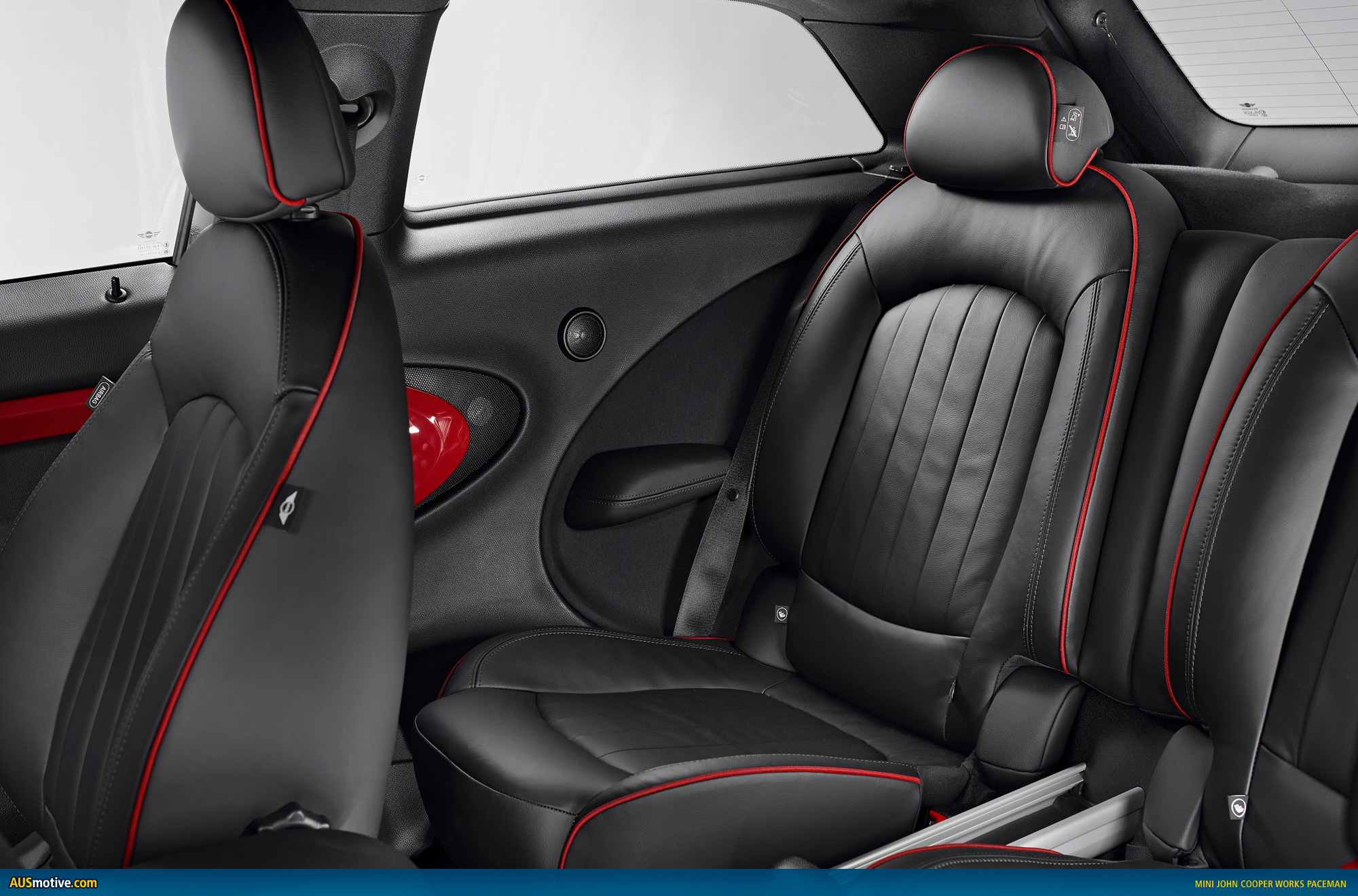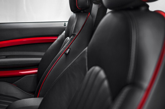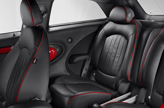 Inside the car, the distinctive interior design combines with the customary sports car ambience of John Cooper Works models to particularly alluring effect. The rear compartment of the MINI John Cooper Works Paceman features a pair of individual seats in which the rear passengers can enjoy that unmistakable racing feeling in lounge-style surroundings. A sports steering wheel with red contrast stitching and John Cooper Works logo, dark-coloured dials for the 260 km/h (160 mph) speedometer and rev counter, anthracite-coloured roof liner, gearshift lever with red shift pattern lettering, red contrast stitching for the gearshift lever gaiter and floor mats with red stitching are all part of the standard equipment count for the new extreme sports model, as are cloth sports seats in Diagonal Track John Cooper Works Carbon Black trim with red contrast stitching. Lounge Leather sports seats in Carbon Black Championship Red are available as an option. Standard Piano Black interior trim strips add the finishing touches to the racing-inspired aura inside the MINI John Cooper Works Paceman. Exclusive Chili Red trim – consisting of red elements for the cockpit and doors and a red stripe for the black trim strips on the centre console – can be ordered as an option.