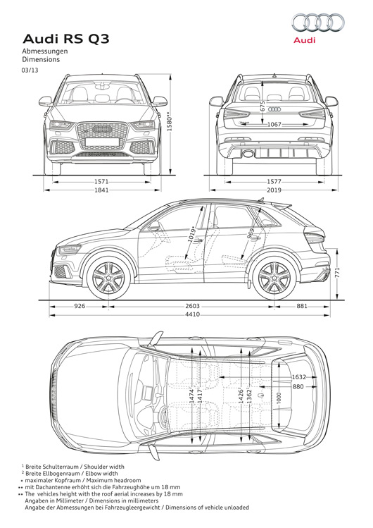 In addition to its engine, the Audi RS Q3 also demonstrates its special status within the Q3 line-up with a number of visual highlights. RS-specific design details emphasise the confident look of the compact, high-performance SUV. They consist of body accents and roof rails in matt aluminium, special door sill plates and door trim strips, a high-gloss black honeycomb front grille, RS front bumper and quattro emblem in the front air intake. A large roof spoiler, rear bumper with distinctive diffuser insert, large elliptical tailpipe and an RS Q3 logo at the rear. At a length of 4,410 mm, the dynamic top model is 25 mm longer than the Audi Q3 and weighs in at 1,730 kg.