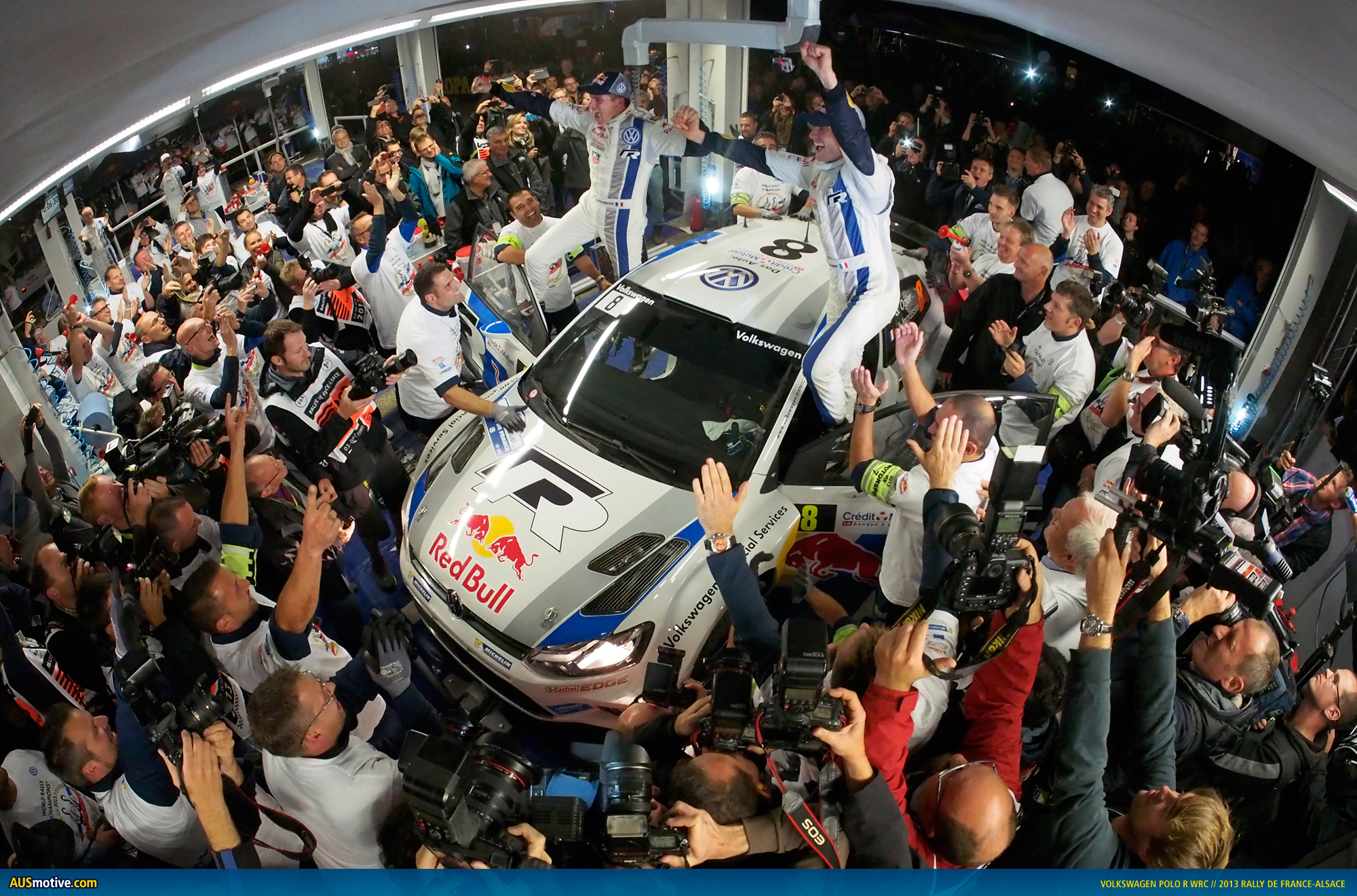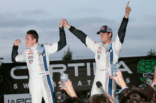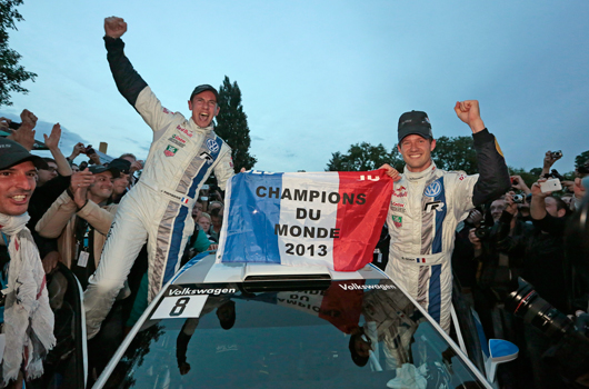 World Champions* with races to spare: Volkswagen works drivers Sébastien Ogier and Julien Ingrassia secured the Driver and Co-Driver titles in the 2013 FIA World Rally Championship (WRC) at their home rally in France. Coming into the last event but two, the pair had won six of the ten rallies so far in the Polo R WRC’s debut season, and the result of the opening Power Stage of the Rally France in front of the European Parliament in Strasbourg means they can no longer be caught at the top of the table, making Ogier and Ingrassia the new World Champions*.