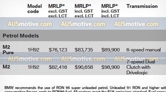 The M2 Coupe starts with the manual only M2 Pure model ,priced from $89,900 and is joined by the M2, priced from $98,900.