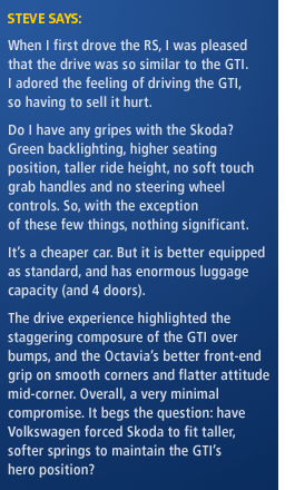 Despite the closeness in driving experience the GTI does have the edge, and it does offer more confidence. This is to be expected, of course. What is pleasing, from Steve’s point of view, is just how close the Octavia RS is compared to his old GTI.