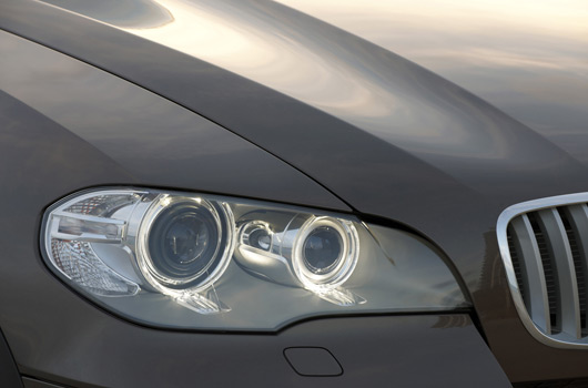 Additionally, the dual round Xenon headlamps featured in the new BMW X5 are also fitted with new LED corona rings and serve as premium and effective daytime running lights. The L-shaped, redesigned taillights, each with two homogeneously illuminated LED light banks, reflect the brand-typical night-time design of the rear end.