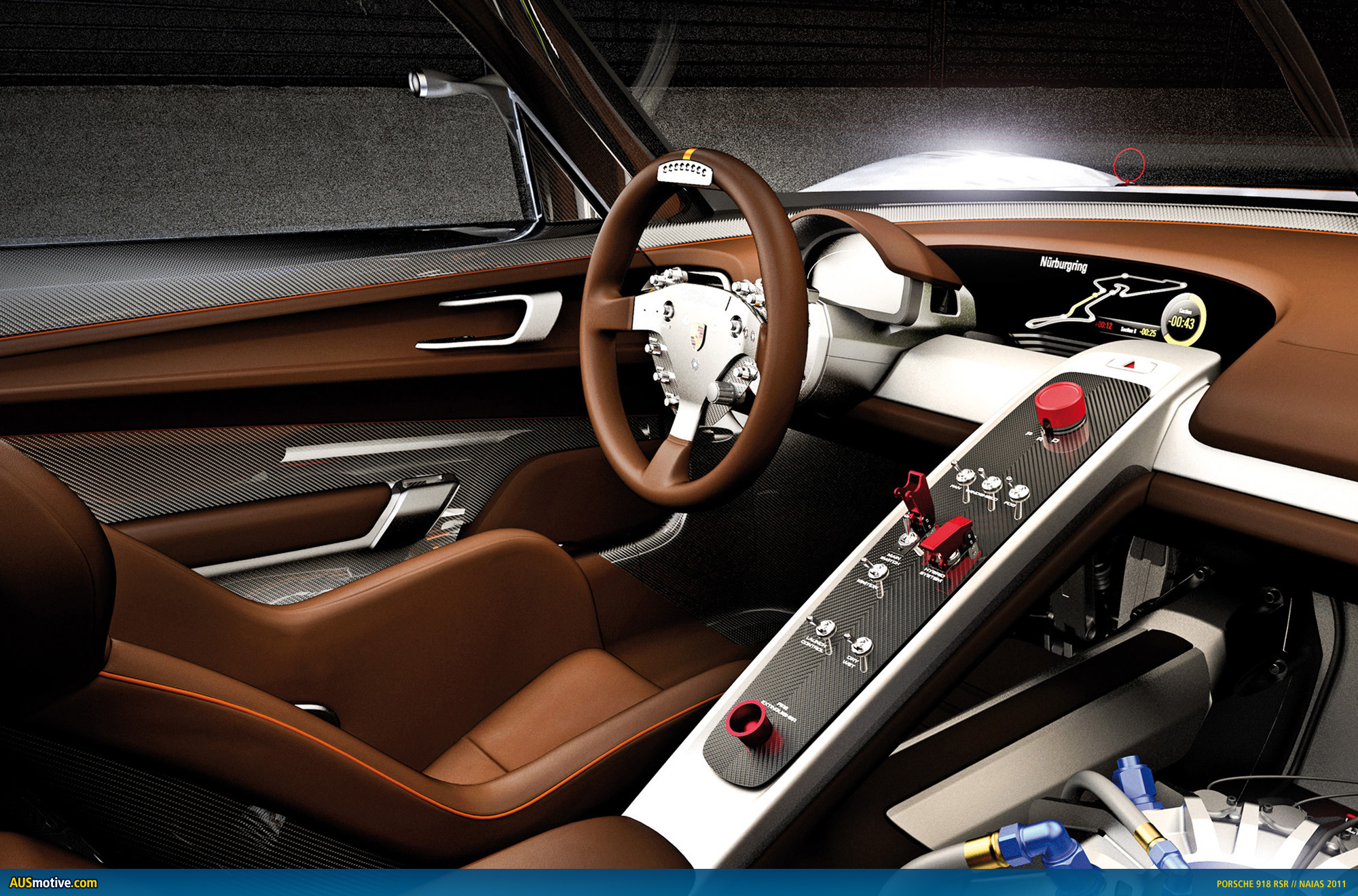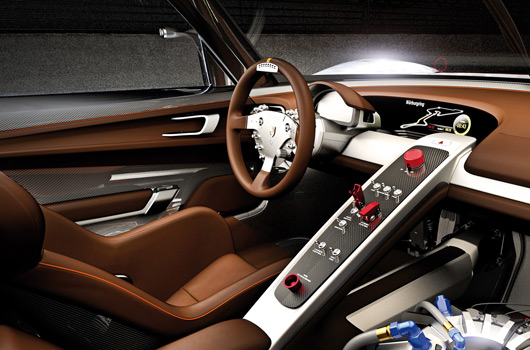 In contrast to the 918 Spyder concept car, unadorned racing atmosphere predominates in the interior of the 918 RSR. The figure-hugging bucket seat’s brown leather covering cites the history of the gentleman driver; the gear flashes on the racing steering wheel and a recuperation display on the steering column in front of the display screen supply the pilot with information. Instead of the futuristic, ergonomically avant-garde centre console with touch-sensitive user interface from the 918 Spyder concept car, the 918 RSR’s cockpit is split by a minimalistic console with rocker switches. Instead of a second seat, the flywheel accumulator is positioned to the right of the console.