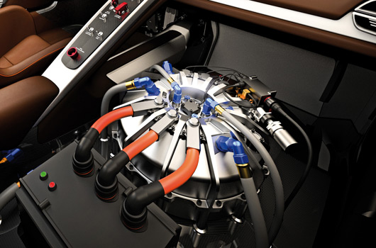 This flywheel accumulator is an electric motor whose rotor rotates at up to 36,000 rpm to store rotation energy. Charging occurs when the two electric motors on the front axle reverse their function during braking processes and operate as generators. At the push of a button, the pilot is able to call up the energy stored in the charged flywheel accumulator and use it during acceleration or overtaking maneuvers. The flywheel is braked electromagnetically in this case in order to additionally supply up to 2 x 75 kW, i.e. a total of 150 kW, from its kinetic energy to the two electric motors on the front axle.