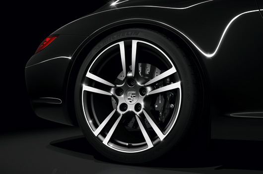 The 911 Black Edition is painted in plain black as standard, with basalt black metallic also available as an option. The Cabrio hood is principally of black cloth. With the Black Edition, the colour highlights are provided by the 19 inch 911 Turbo II bi-colour wheels, their dichroic effect ideally complementing the discreet elegance of the exterior colour. In addition, the rims provide an unobstructed view of the brakes, naturally with black, four-piston aluminium monobloc fixed callipers. The grey top-tint in the windscreen is standard in the 911 Black Edition, rounding off the overall impression on a harmonious note.