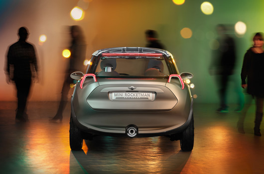 Large wheels and the three-level structural split of body, “wraparound†green-house and roof resting on top give the flanks the same appearance as the MINI models already in series production. The windows taper as they extend back towards the rear, emphasising the body’s dynamic wedge shape and offering an immediate hint of the vehicle’s sporty and agile character. The high waist-line, accentuated on the MINI by a chrome frame ringing the vehicle, takes the form of a light strip on the MINI Rocketman Concept and throws the study’s powerful silhouette into even sharper focus.