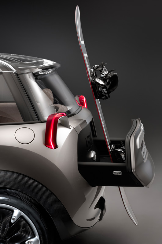An intelligent folding mechanism makes it possible to lock the cargo drawer of the MINI Rocketman Concept either higher up or further in towards the pas-senger compartment, as the loading scenario demands. This allows loads to be transported out of sight and protected from the weather. If required, items can also be loaded through into the passenger compartment. In addition, the open-top cargo drawer can also serve as a rear luggage carrier. Here, purpose-built inserts make it easier to transport snowboards and other bulky items of sports equipment. Added to which, the glass tailgate, which extends well into the roof, helps to enhance loading flexibility. It is connected with the body via a centrally positioned hinge with integrated gas strut system, which also allows it to be opened when the rear carrier is loaded with gear.