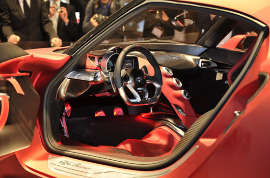 On the Alfa Romeo 4C Concept technology and materials derived from the 8C Competizione find a home – carbon, aluminium, rear-wheel drive – and technology derived from Alfa Romeo models currently on sale: the 1750 turbo petrol engine with direct injection, the “Alfa TCT” twin dry clutch transmission and the Alfa DNA dynamic control selector.