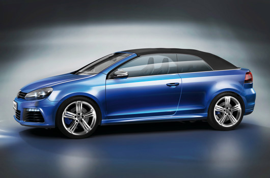 Golf R Cabriolet concept: Volkswagen just recently introduced the new Golf Cabriolet, and the designers and engineers of Volkswagen R GmbH have already come up with an extremely sporty variant of this model: the Golf R Cabriolet Concept. Like its closed top counterpart, the 199 kW / 270 PS Cabriolet concept races to the 100 km/h mark in less than six seconds. Their top speeds are also identical at 250 km/h. This makes the R Cabriolet the fastest open-top Golf ever. Even more impressive, however, is the engine’s tremendous torque – 350 Newton metres from a low 2,500 rpm make this cabriolet an ideal cruiser.