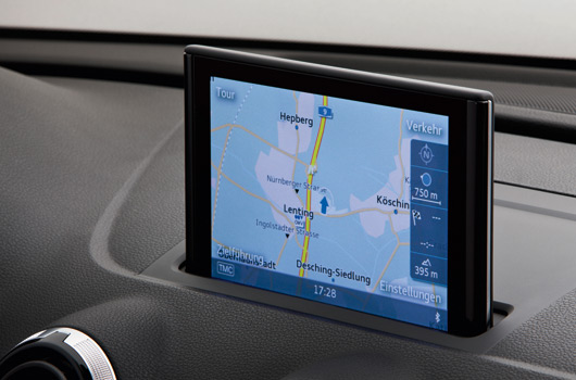 MMI navigation plus with MMI touch is available as the top version – it is a media centre with 60 GB memory capacity, DVD drive and whole-word voice control. The high-resolution 7-inch monitor shows map images in detailed 3D graphics. It links the MMI navigation plus to mobile phones and mobile player devices via the integrated Bluetooth interface.