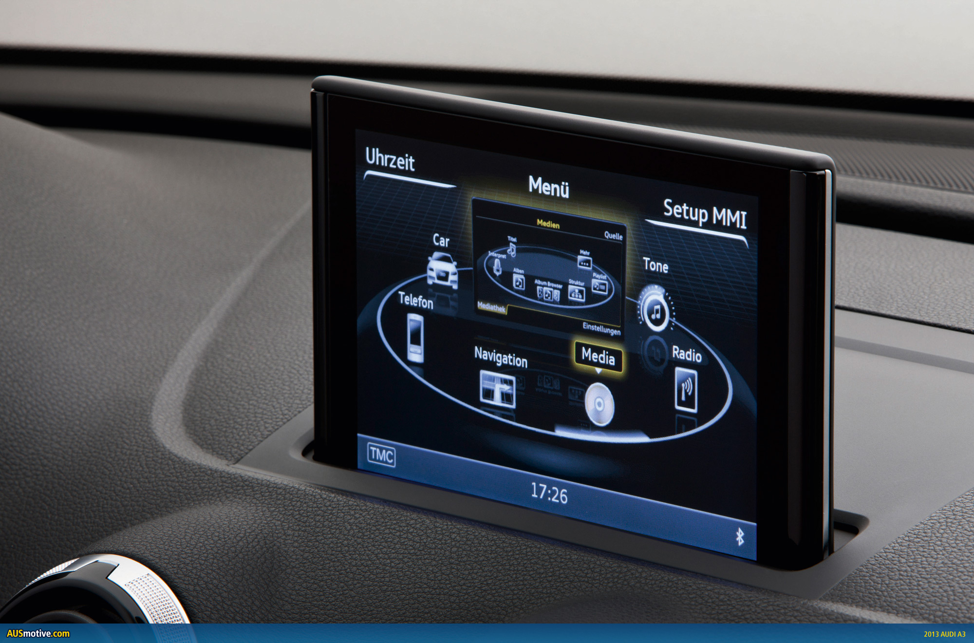 When the system is started, the monitor of the MMI operating system is electrically deployed from the instrument panel. Depending on the version, its screen has either a 5.8-inch or 7-inch diagonal. It has an attractive and technically sophisticated look with a high-gloss black housing made of ultra-lightweight magnesium, which is only 11 millimetres thick.