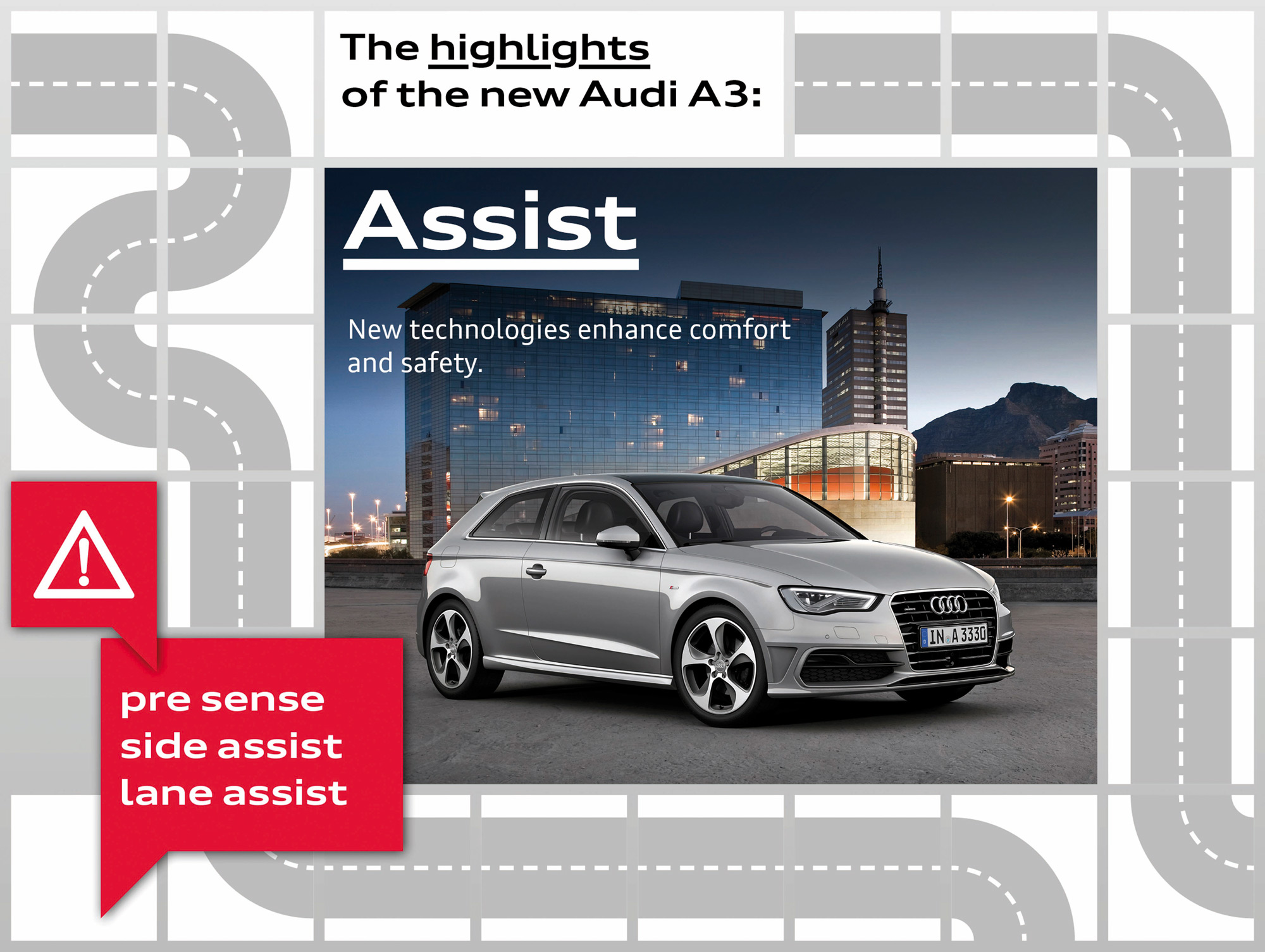Another technical area in which the new Audi A3 will excel is in its new high-performance driver assistance systems. They range from radar-assisted adaptive cruise control to Audi side assist, Audi active lane assist, traffic sign detection, park assist and the Audi pre sense basic safety system.