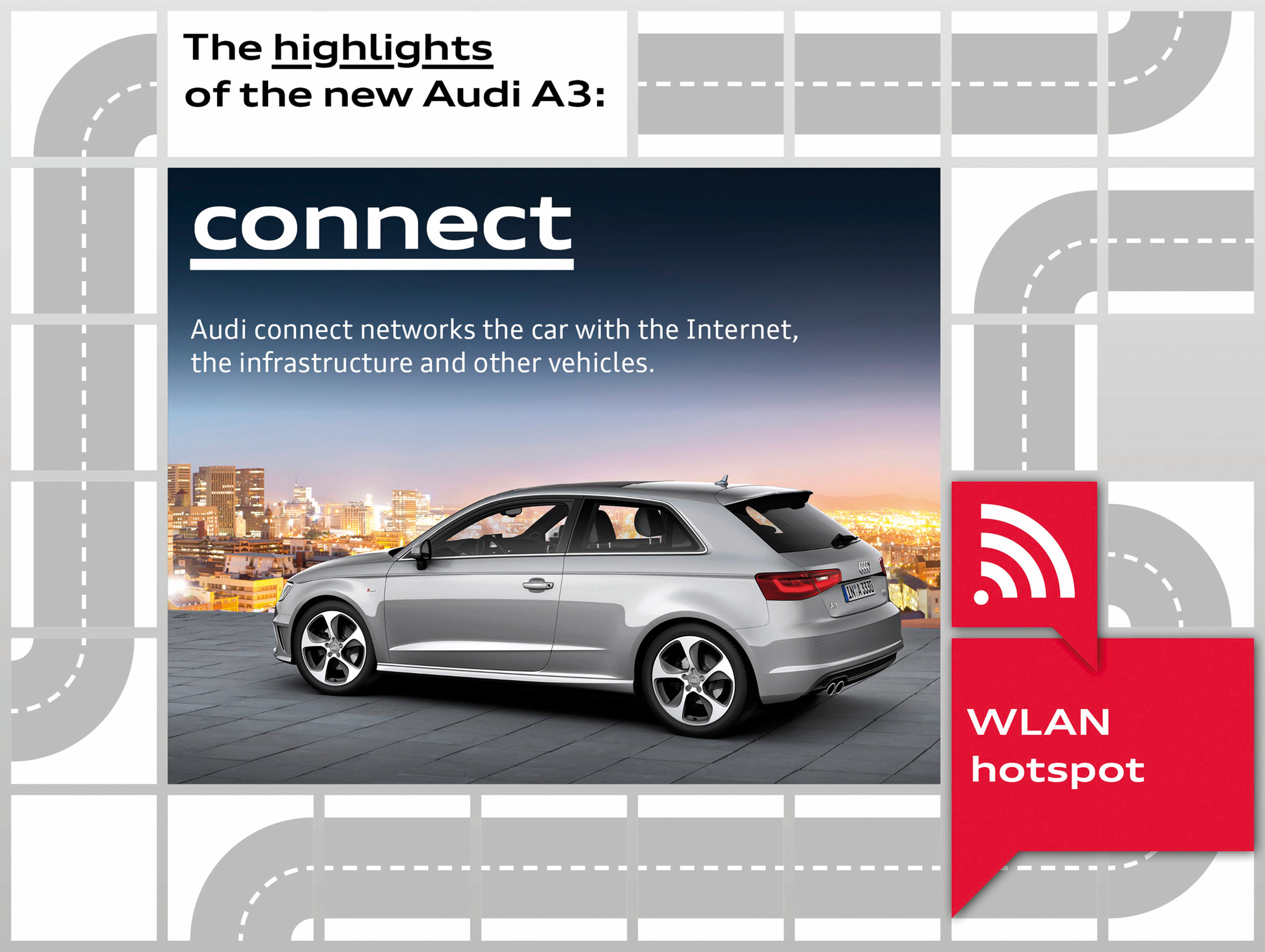 The Audi connect system bundles all infotainment technologies that let the driver network with the Internet, infrastructure and other vehicles. The central component is the Mobile phone preparation – High with Online Services as a supplement to MMI navigation plus. It produces the connection to the Internet via a UMTS module. Passengers can conveniently surf and email with up to eight mobile devices via an integrated WLAN hotspot.