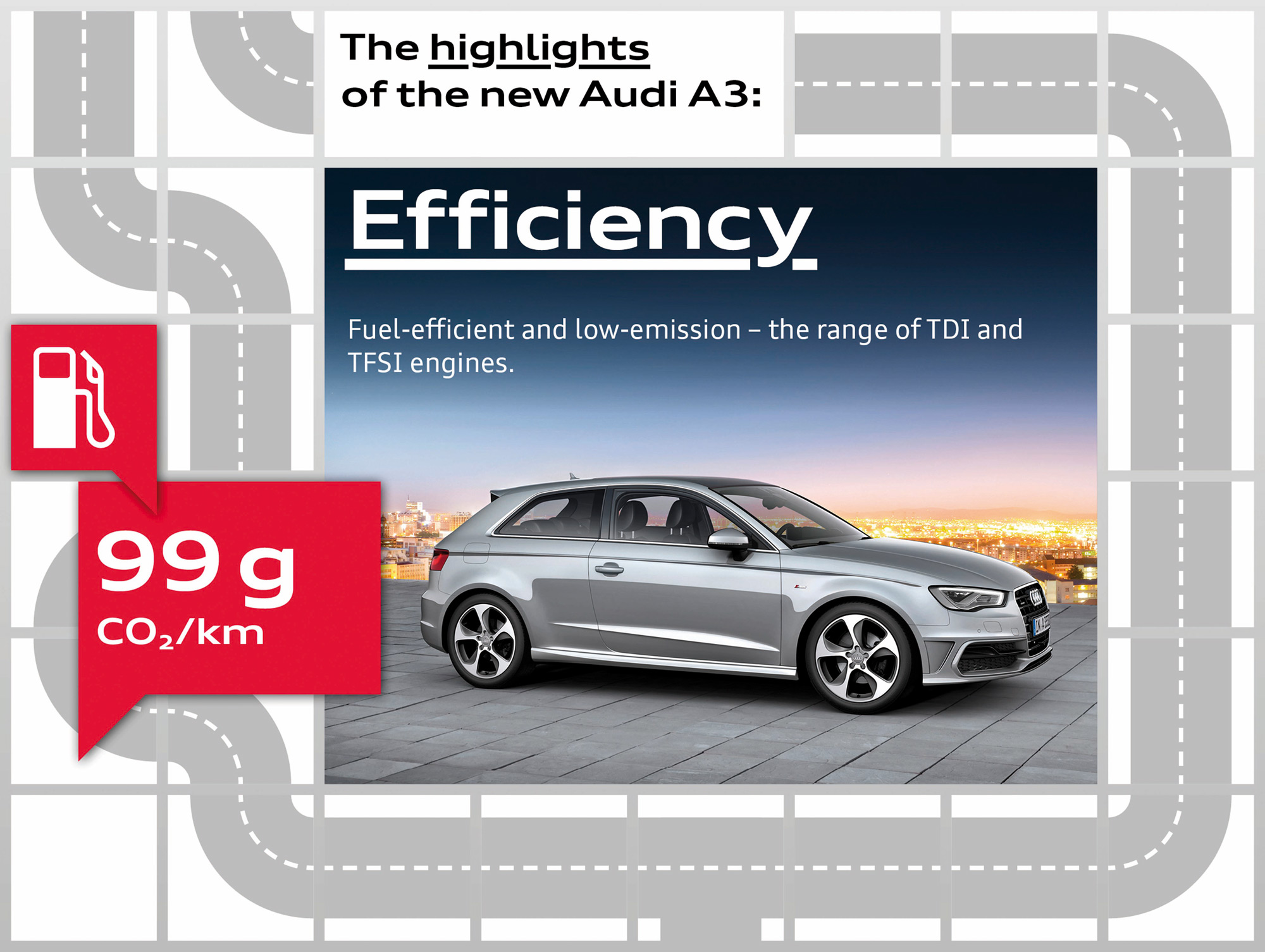 At launch, the new A3 will be available with one TDI and two TFSI engines, all of which incorporate many efficiency technologies – direct injection, turbocharging, innovative thermal management and the start-stop system. All three units are ‘downsized’ in the interest of efficiency but deliver performance and response worthy of a larger capacity engine thanks to advanced turbo charging. The benefit of this concept can be seen in fuel economy improvements averaging 12 per cent.
